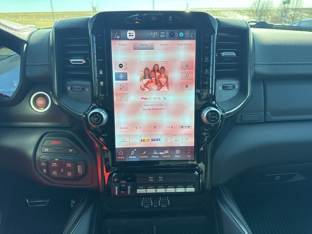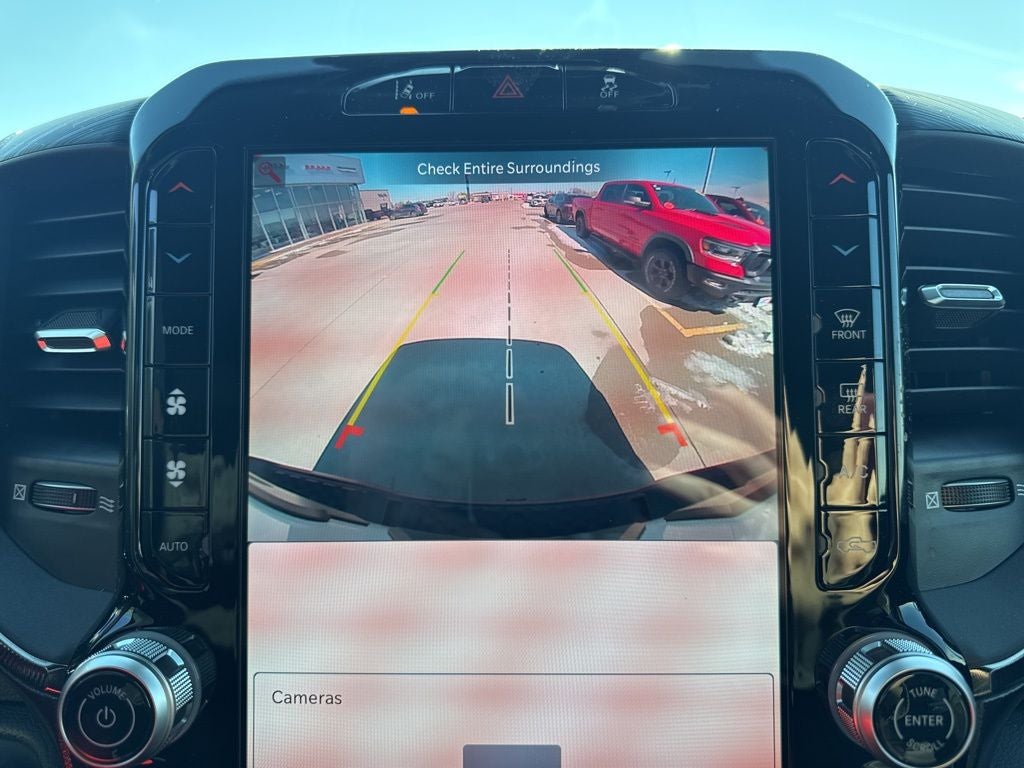 Quick Order Package 22Y RHO, 10 Speakers, 3.92 Rear Axle Ratio, 4-Wheel Disc Brakes, 4G LTE Wi-Fi Hot Spot, ABS brakes, Adaptive suspension, Adjustable pedals, Air Conditioning, Alloy wheels, AM/FM radio, Apple CarPlay/Android Auto, Auto High-beam Headlights, Auto Power-Folding Mirrors, Auto-dimming door mirrors, Auto-Dimming Exterior Driver Mirror, Auto-dimming Rear-View mirror, Automatic temperature control, Brake assist, Compass, Connected Travel and Traffic Services, Connectivity - US/Canada, Delay-off headlights, Disassociated Touchscreen Display, Driver door bin, Driver vanity mirror, Dual front impact airbags, Dual front side impact airbags, Electronic Stability Control, Exterior Mirrors Courtesy Lamps, Exterior Mirrors with Heating Element, Exterior Mirrors with Supplemental Signals, Exterior Parking Camera Rear, Flareside Box, Front anti-roll bar, Front Bucket Seats, Front Center Armrest w/Storage, Front dual zone A/C, Front fog lights, Front License Plate Bracket, Front reading lights, Front wheel independent suspension, Fully automatic headlights, Garage door transmitter, GPS Navigation, HD Radio, Heated door mirrors, Heated front seats, Heated steering wheel, Illuminated entry, Integrated Center Stack Radio, Integrated Voice Command with Bluetooth®, Leather Shift Knob, Leather steering wheel, Leather Trimmed Bucket Seats, Low tire pressure warning, MOPAR Off-Road Style Running Boards, Navigation System, Occupant sensing airbag, Outside temperature display, Overhead airbag, Overhead console, Panic alarm, Passenger door bin, Passenger vanity mirror, Power door mirrors, Power driver seat, Power passenger seat, Power steering, Power windows, Radio data system, Radio: Uconnect 5 Navigation with 12.0 Display, Rear reading lights, Rear seat center armrest, Rear step bumper, Rear window defroster, Remote keyless entry, Security system, SiriusXM Radio Service, Speed control, Split folding rear seat, Sport steering wheel, Steering wheel mounted audio controls, Tachometer, Telescoping steering wheel, Tilt steering wheel, Traction control, Trip computer, Turn signal indicator mirrors, USB Host Flip, Variably intermittent wipers, Voltmeter, Wheels: 18 x 9 Black Paint/Polish Aluminum, Quick Order Package 22Y RHO. 2026 Ram 1500 RHO 4WD