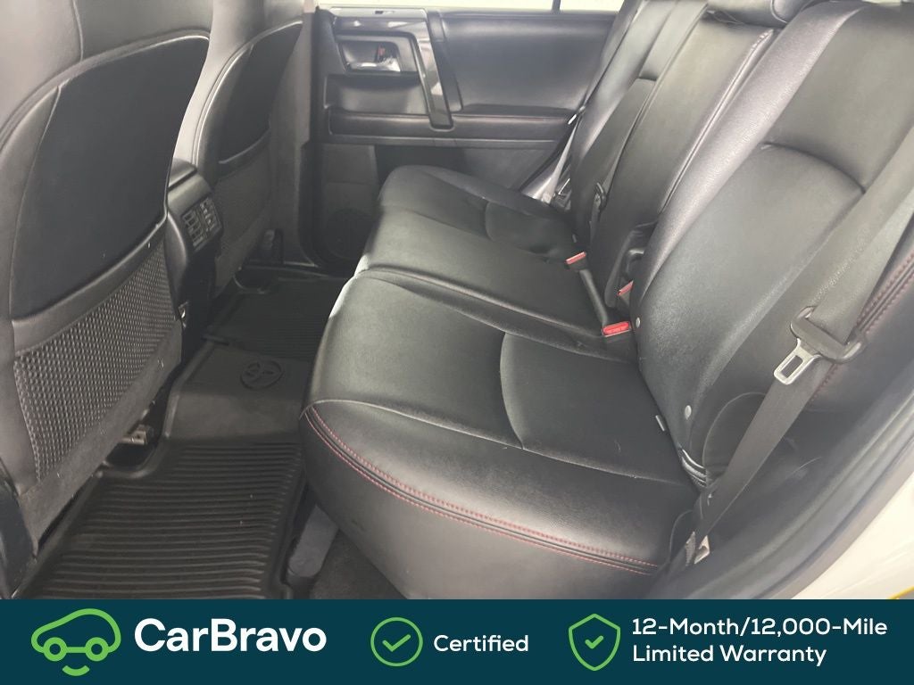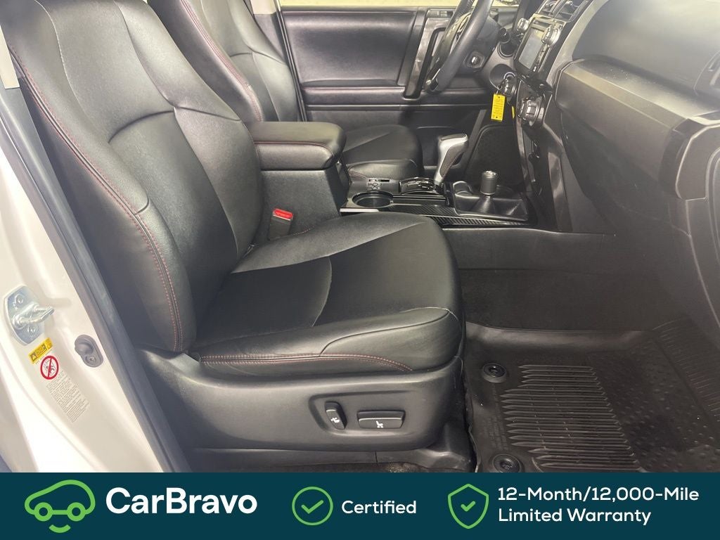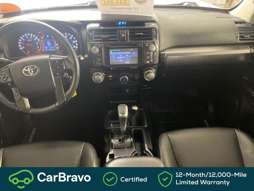 Clean CARFAX. Certified. CarBravo Certified, 4WD, Black Graphite w/Leather Seat Trim, 3.727 Axle Ratio, 4-Wheel Disc Brakes, 8 Speakers, ABS brakes, Air Conditioning, Alloy wheels, AM/FM radio: SiriusXM, Anti-whiplash front head restraints, Auto-Dimming Rear-View Mirror, Auto-dimming Rear-View mirror, Black Roof Rails, Body Color Heated Mirrors, Brake assist, Bumpers: body-color, CD player, Compass, Driver door bin, Driver vanity mirror, Dual front impact airbags, Dual front side impact airbags, Electronic Stability Control, Emergency communication system: Safety Connect, Exterior Parking Camera Rear, Front anti-roll bar, Front Bucket Seats, Front Center Armrest, Front fog lights, Front reading lights, Front wheel independent suspension, Garage Door Opener, Garage door transmitter: HomeLink, Heated door mirrors, Heated Front Bucket Seats, Heated front seats, Illuminated entry, Knee airbag, Leather Shift Knob, Low tire pressure warning, Moonroof w/Tilt Up & Slide, Navigation System, Occupant sensing airbag, Outside temperature display, Overhead airbag, Overhead console, Panic alarm, Passenger door bin, Passenger vanity mirror, Power door mirrors, Power driver seat, Power passenger seat, Power steering, Power windows, Radio: Entune Premium Audio w/Navigation, Rear anti-roll bar, Rear seat center armrest, Rear window defroster, Rear window wiper, Remote keyless entry, Roof rack: rails only, Security system, Softex Synthetic Leather Seat Trim, Speed control, Speed-sensing steering, Split folding rear seat, Spoiler, Steering wheel mounted audio controls, Tachometer, Telescoping steering wheel, Tilt steering wheel, Traction control, Trip computer, Turn signal indicator mirrors, Variably intermittent wipers, Wheels: 17 x 7.5 7-Spoke Unique Off-Road Alloy, 4WD, Black Graphite w/Leather Seat Trim. Super White 2019 Toyota 4Runner TRD Off-Road Premium 4WD 5-Speed Automatic with Overdrive 4.0L V6 SMPI DOHC