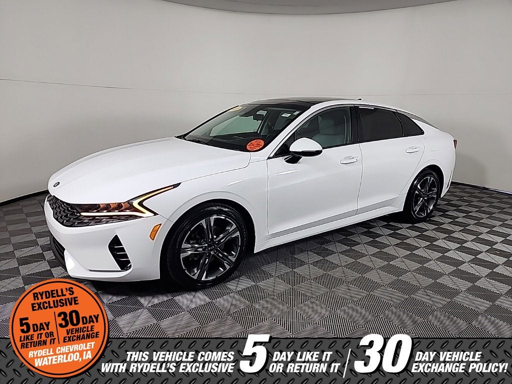 27/37 City/Highway MPG 10-Way Power Passenger Seat, 4-Wheel Disc Brakes, 6 Speakers, ABS brakes, Air Conditioning, Alloy wheels, AM/FM radio: SiriusXM, Apple CarPlay & Android Auto, Auto High-beam Headlights, Automatic temperature control, Brake assist, Bumpers: body-color, Carpeted Floor Mats, Delay-off headlights, Driver door bin, Driver vanity mirror, Dual front impact airbags, Dual front side impact airbags, Electronic Stability Control, Emergency communication system, EX Ash Blue Color Package, EX Premium Package, Forward Collision Avoidance-Assist - Cyclist, Forward Collision Avoidance-Assist - Junction Turn, Four wheel independent suspension, Front anti-roll bar, Front Bucket Seats, Front Center Armrest, Front dual zone A/C, Front reading lights, Fully automatic headlights, Heated & Ventilated Front Bucket Seats, Heated door mirrors, Heated front seats, Heated Steering Wheel, Highway Driving Assist, Illuminated entry, Knee airbag, Leatherette Seat Trim, LED Rear Combi Lamps, Low tire pressure warning, Memory Driver's Seat & Outside Mirrors, Navigation-Based Smart Cruise Control - Curve, Occupant sensing airbag, Outside Mirrors w/LED Turn Signals, Outside temperature display, Overhead airbag, Overhead console, Panic alarm, Parking Collision Avoidance-Assist - Reverse, Passenger door bin, Passenger vanity mirror, Power Child Lock, Power door mirrors, Power driver seat, Power moonroof, Power steering, Power windows, Radio data system, Radio: AM/FM/MP3/SiriusXM Audio System, Radio: AM/FM/SiriusXM Bose Premium Audio System, Rear anti-roll bar, Rear reading lights, Rear seat center armrest, Rear side impact airbag, Rear window defroster, Remote keyless entry, Safe Exit Assist w/Lock, Security system, Smart Cruise Control w/Stop & Go, Smart Key w/ Push Button and Remote Start, Speed control, Speed-sensing steering, Split folding rear seat, Steering wheel mounted audio controls, Tachometer, Telescoping steering wheel, Tilt steering wheel, Traction control, Trip computer, Variably intermittent wipers, Ventilated front seats, Wheels: 7.5J x 18 Gray Machined Finish Alloy. Glacial White Pearl 2021 Kia K5 EX FWD 8-Speed Automatic 1.6L I4 DGI