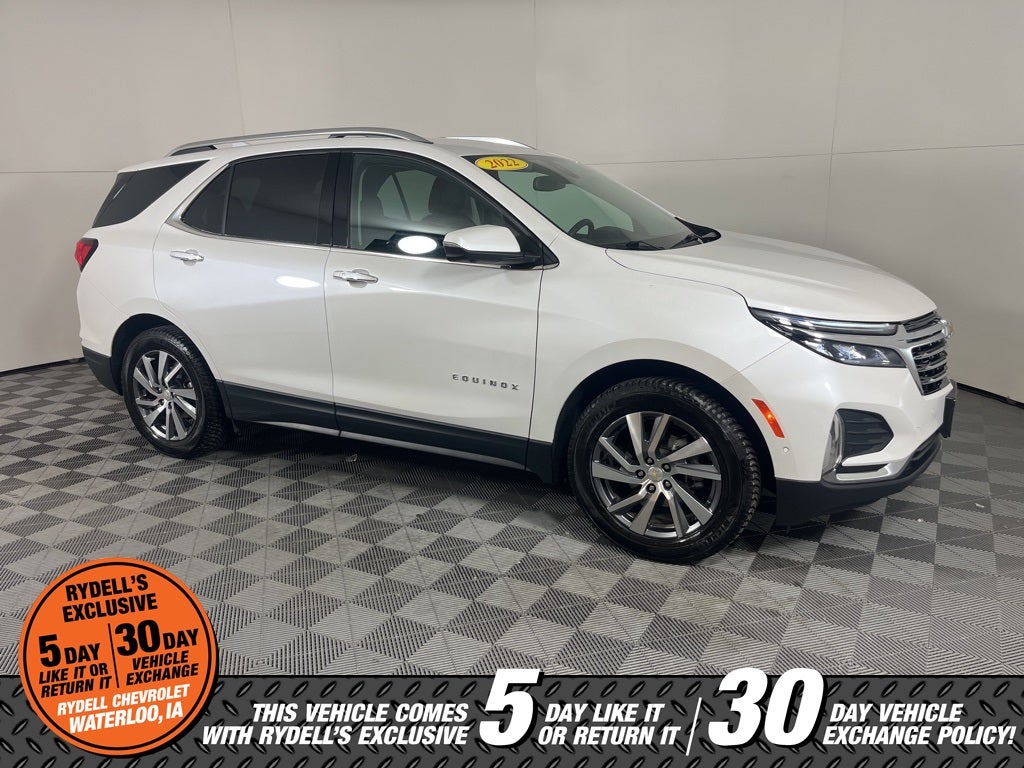 CARFAX One-Owner. 25/30 City/Highway MPG AWD, 18 Aluminum Wheels, 2 Rear USB Charging-Only Ports, 2 USB Data Ports, 2 USB Data Ports w/SD Card Reader, 2-Way Power Driver Lumbar Control Seat Adjuster, 3.87 Final Drive Axle Ratio, 4-Wheel Disc Brakes, 6 Speaker Audio System Feature, 6 Speakers, 8-Way Power Driver Seat Adjuster, 8-Way Power Front Passenger Seat Adjuster, ABS brakes, Adaptive Cruise Control, Air Conditioning, Alloy wheels, AM/FM radio: SiriusXM, Auto High-beam Headlights, Auto-dimming door mirrors, Auto-dimming Rear-View mirror, Automatic Front & Rear Parking Assist, Automatic temperature control, Bluetooth® For Phone, Bose Premium 7-Speaker Audio System Feature, Brake assist, Bumpers: body-color, Cold Air Grille Shutter, Compass, Confidence & Convenience II Package, Delay-off headlights, Driver Confidence III Package, Driver Convenience II Package, Driver door bin, Driver vanity mirror, Dual front impact airbags, Dual front side impact airbags, Electronic Stability Control, Emergency communication system: OnStar and Chevrolet connected services capable, Four wheel independent suspension, Front anti-roll bar, Front Bucket Seats, Front Center Armrest, Front dual zone A/C, Front fog lights, Front Passenger 4-Way Manual Seat Adjuster, Front reading lights, Fully automatic headlights, Garage door transmitter, HD Surround Vision, Heated door mirrors, Heated Driver & Front Passenger Seats, Heated front seats, Heated Rear Outboard Seating Positions, Heated steering wheel, Illuminated entry, Infotainment II Package, Low tire pressure warning, Memory seat, Occupant sensing airbag, Outside temperature display, Overhead airbag, Overhead console, Panic alarm, Passenger door bin, Passenger vanity mirror, Perforated Leather-Appointed Seat Trim, Power door mirrors, Power driver seat, Power Liftgate, Power steering, Power windows, Preferred Equipment Group 1LZ, Premium audio system: Chevrolet Infotainment 3 Plus, Radio data system, Radio: Chevrolet Infotainment 3 Plus System, Radio: Chevrolet Infotainment 3 Plus System w/Navi, Rear anti-roll bar, Rear reading lights, Rear seat center armrest, Rear window defroster, Rear window wiper, Remote keyless entry, Roof rack: rails only, Security system, SiriusXM Radio, Speed control, Speed-sensing steering, Split folding rear seat, Spoiler, Steering wheel mounted audio controls, Tachometer, Telescoping steering wheel, Tilt steering wheel, Traction control, Trip computer, Turn signal indicator mirrors, Variably intermittent wipers, Ventilated Driver Seat, Ventilated Front Passenger Seat, Wireless Apple CarPlay/Wireless Android Auto, AWD. Iridescent Pearl Tricoat 2022 Chevrolet Equinox Premier AWD 6-Speed Automatic Electronic with Overdrive 1.5L DOHC