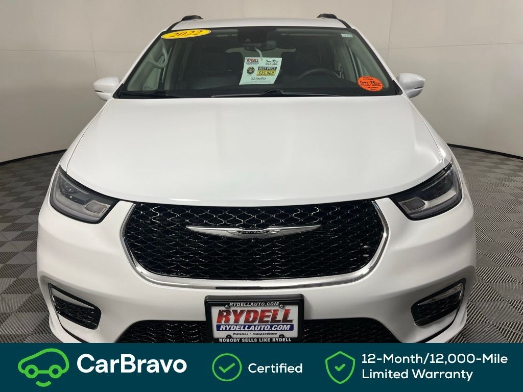 Clean CARFAX. CARFAX One-Owner. 19/28 City/Highway MPG 10.1 Touchscreen Display, 17 x 7.0 Aluminum Wheels, 3.25 Axle Ratio, 3rd row seats: split-bench, 4-Wheel Disc Brakes, 6 Speakers, ABS brakes, Air Conditioning, Alloy wheels, AM/FM radio: SiriusXM, Apple CarPlay, Apple CarPlay/Android Auto, Auto-dimming Rear-View mirror, Automatic temperature control, Black Seats, Brake assist, Bumpers: body-color, Compass, Delay-off headlights, Disassociated Touchscreen Display, Driver door bin, Driver vanity mirror, Driver's Seat Mounted Armrest, Dual front impact airbags, Dual front side impact airbags, Electronic Stability Control, For More Info, Call 800-643-2112, Four wheel independent suspension, Front anti-roll bar, Front Bucket Seats, Front dual zone A/C, Front fog lights, Front reading lights, Fully automatic headlights, Garage door transmitter, Google Android Auto, GPS Antenna Input, Heated door mirrors, Heated front seats, Heated steering wheel, Illuminated entry, Integrated Active Noise Cancellation, Integrated Center Stack Radio, Knee airbag, Low tire pressure warning, Memory seat, Occupant sensing airbag, Outside temperature display, Overhead airbag, Overhead console, Panic alarm, ParkSense Rear Park Assist Unavailable, ParkSense Rear Park Assist w/Stop, ParkView Rear Back-Up Camera, Passenger door bin, Passenger seat mounted armrest, Passenger vanity mirror, Perforated Leather Trim Bucket Seats, Power door mirrors, Power driver seat, Power Liftgate, Power steering, Power windows, Quick Order Package 27L, Radio data system, Radio: Uconnect 5 w/10.1 Display, Rain sensing wipers, Rear air conditioning, Rear reading lights, Rear window defroster, Rear window wiper, Reclining 3rd row seat, Remote keyless entry, Roof rack, Safety Sphere Unavailable, Security system, SiriusXM Radio Service, SiriusXM Satellite Radio, Speed control, Split folding rear seat, Spoiler, Steering wheel mounted audio controls, Tachometer, Telescoping steering wheel, Tilt steering wheel, Touring Suspension, Traction control, Trip computer, Turn signal indicator mirrors, USB Host Flip, Variably intermittent wipers, Voltmeter. Bright White Clearcoat 2022 Chrysler Pacifica Touring L FWD 9-Speed 948TE Automatic 3.6L V6 24V VVT
