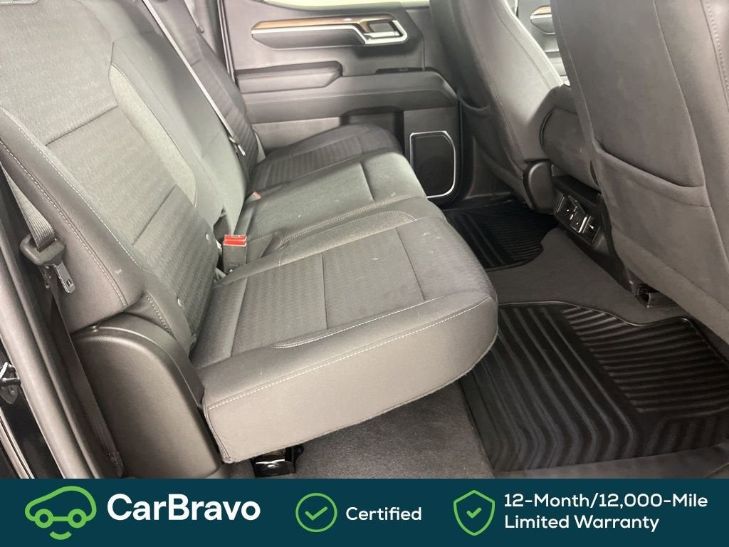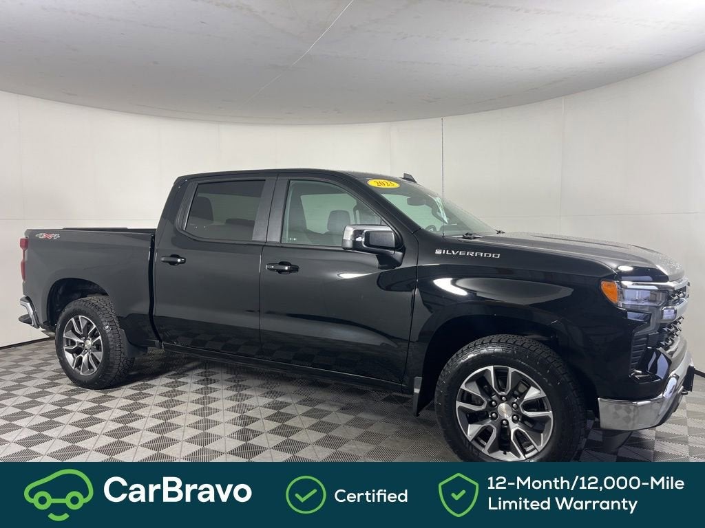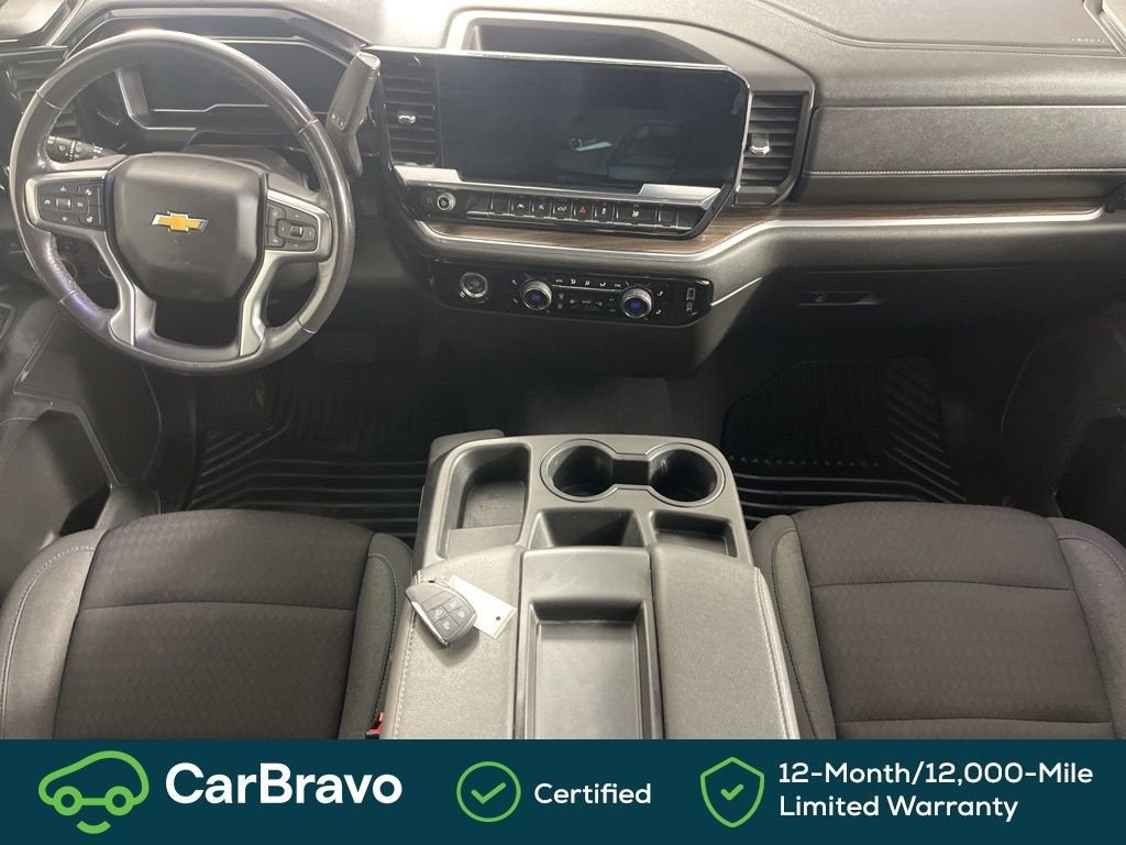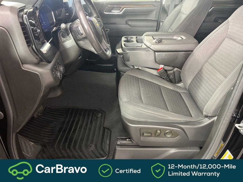 Clean CARFAX. CARFAX One-Owner. Certified. Yes Certified, 8-Speed Automatic, 4WD, Jet Black Cloth, 10-Way Power Driver Seat w/Lumbar, 12.3 Multicolor Reconfigurable Digital Display, 120-Volt Bed Mounted Power Outlet, 120-Volt Instrument Panel Power Outlet, 3.42 Rear Axle Ratio, 4-Wheel Disc Brakes, 40/20/40 Front Split-Bench Seat, 6 Speakers, 6-Speaker Audio System, ABS brakes, Air Conditioning, All-Star Edition, Alloy wheels, AM/FM radio: SiriusXM with 360L, Apple CarPlay/Android Auto, Auto High-beam Headlights, Auto-Locking Rear Differential, Automatic Emergency Braking, Automatic temperature control, Bluetooth® For Phone, Brake assist, Bumpers: chrome, Chevrolet Connected Access Capable, Chrome Mirror Caps, Cloth Seat Trim, Color-Keyed Carpeting Floor Covering, Compass, Convenience Package, Deep-Tinted Glass, Delay-off headlights, Driver door bin, Driver vanity mirror, Dual front impact airbags, Dual front side impact airbags, Dual Rear USB Ports (Charge Only), Dual-Zone Automatic Climate Control, Electric Rear-Window Defogger, Electrical Steering Column Lock, Electronic Cruise Control, Electronic Stability Control, Following Distance Indicator, Forward Collision Alert, Front anti-roll bar, Front Center Armrest w/Storage, Front dual zone A/C, Front Frame-Mounted Black Recovery Hooks, Front License Plate Kit, Front Pedestrian Braking, Front reading lights, Front wheel independent suspension, Fully automatic headlights, HD Rear Vision Camera, Heated door mirrors, Heated Driver & Front Outboard Passenger Seats, Heated front seats, Heated Steering Wheel, Heated steering wheel, High Capacity Suspension Package, Hitch Guidance, Illuminated entry, IntelliBeam Automatic High Beam On/Off, Keyless Open & Start, Lane Keep Assist w/Lane Departure Warning, LED Cargo Area Lighting, Low tire pressure warning, Not Equipped w/Functional Cab & Bed Power Outlets, Not Equipped w/Steering Column Lock, Occupant sensing airbag, OnStar & Chevrolet Connected Services Capable, Outside temperature display, Overhead airbag, Overhead console, Panic alarm, Passenger door bin, Passenger vanity mirror, Power door mirrors, Power driver seat, Power Front Windows w/Driver Express Up/Down, Power Front Windows w/Passenger Express Down, Power Rear Windows w/Express Down, Power steering, Power windows, Premium audio system: Chevrolet Infotainment 3 Premium, Radio data system, Radio: Chevrolet Infotainment 3 Premium System, Rear 60/40 Folding Bench Seat (Folds Up), Rear reading lights, Rear step bumper, Rear window defroster, Remote keyless entry, Remote Vehicle Starter System, Security system, SiriusXM w/360L, Speed control, Speed-sensing steering, Split folding rear seat, Standard Suspension Package, Steering Wheel Audio Controls, Steering wheel mounted audio controls, Tachometer, Telescoping steering wheel, Theft Deterrent System (Unauthorized Entry), Tilt steering wheel, Traction control, Trailering Package, Trip computer, Variably intermittent wipers, Voltmeter, Wheels: 18 x 8.5 Bright Silver Painted Aluminum, Wheels: 20 x 9 Painted Aluminum, Wi-Fi Hot Spot Capable, Wireless Phone Projection, Wrapped Steering Wheel, 8-Speed Automatic, 4WD, Jet Black Cloth. Black 2023 Chevrolet Silverado 1500 LT LT1 4WD 8-Speed Automatic 2.7L Turbo