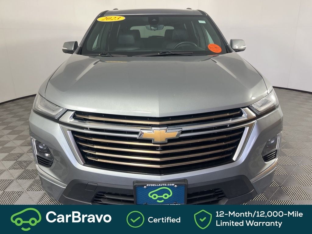 Clean CARFAX. CARFAX One-Owner. Certified. One Owner, CarBravo Certified, AWD, 10 Speakers, 20 Polished Aluminum Wheels, 3.49 Axle Ratio, 3rd row seats: split-bench, 4-Wheel Disc Brakes, 6-Way Power Front Passenger Seat, 8-Way Power Driver Seat Adjuster, ABS brakes, Air Conditioning, Alloy wheels, AM/FM radio: SiriusXM with 360L, Apple CarPlay/Android Auto, Auto High-beam Headlights, Auto-dimming door mirrors, Auto-dimming Rear-View mirror, Automatic temperature control, Bose Premium 10-Speaker Audio System Feature, Brake assist, Bumpers: body-color, Compass, Delay-off headlights, Driver door bin, Driver vanity mirror, Dual front impact airbags, Dual front side impact airbags, Electronic Stability Control, Emergency communication system, Exterior Parking Camera Rear, Four wheel independent suspension, Front anti-roll bar, Front Bucket Seats, Front Center Armrest, Front dual zone A/C, Front License Plate Bracket Mounting Package, Front Passenger 2-Way Power Lumbar, Front reading lights, Fully automatic headlights, Garage door transmitter, Heated 2nd Row Outboard Position Seats, Heated door mirrors, Heated Driver & Front Passenger Seats, Heated front seats, Heated rear seats, Heated steering wheel, Illuminated entry, Leather steering wheel, Low tire pressure warning, Memory seat, Navigation System, Occupant sensing airbag, Outside temperature display, Overhead airbag, Overhead console, Panic alarm, Passenger door bin, Passenger vanity mirror, Perforated Leather-Appointed Seat Trim, Power door mirrors, Power Driver Lumbar Control, Power driver seat, Power Liftgate, Power moonroof: Dual SkyScape, Power passenger seat, Power steering, Power windows, Preferred Equipment Group 2LZ, Premium audio system: Chevrolet Infotainment 3 Plus, Radio data system, Radio: Chevrolet Infotainment 3 Plus System w/Navi, Rear air conditioning, Rear anti-roll bar, Rear reading lights, Rear window defroster, Rear window wiper, Remote keyless entry, Security system, SiriusXM w/360L, Speed control, Speed-sensing steering, Spoiler, Steering wheel memory, Steering wheel mounted audio controls, Tachometer, Telescoping steering wheel, Tilt steering wheel, Traction control, Trip computer, Turn signal indicator mirrors, Variably intermittent wipers, Ventilated Driver & Front Passenger Seats, Ventilated front seats, Voltmeter, AWD. Sterling Gray Metallic 2023 Chevrolet Traverse High Country AWD 9-Speed Automatic 3.6L V6 SIDI VVT