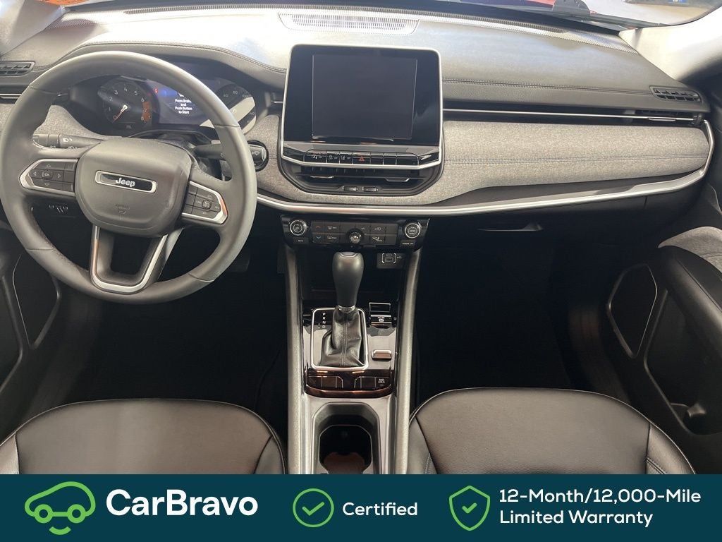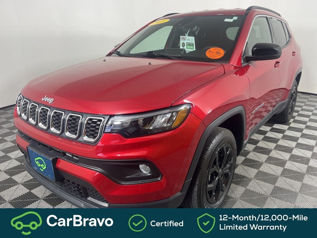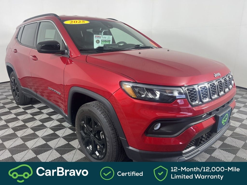 Clean CARFAX. CARFAX One-Owner. Certified. 24/32 City/Highway MPG CarBravo Certified, 4WD, 3.73 Final Drive Ratio, 4-Wheel Disc Brakes, 6 Speakers, ABS brakes, Air Conditioning, Alloy wheels, AM/FM radio: SiriusXM, Apple CarPlay/Android Auto, Auto High-beam Headlights, Brake assist, Bumpers: body-color, Compass, Delay-off headlights, Driver door bin, Driver vanity mirror, Dual front impact airbags, Dual front side impact airbags, Electronic Stability Control, Emergency communication system: Jeep Connect, Four wheel independent suspension, Front anti-roll bar, Front Bucket Seats, Front Center Armrest w/Storage, Front fog lights, Front License Plate Bracket, Front reading lights, Fully automatic headlights, Heated door mirrors, Heated front seats, Heated steering wheel, Illuminated entry, Knee airbag, Leather Shift Knob, Leather steering wheel, Low tire pressure warning, Occupant sensing airbag, Outside temperature display, Overhead airbag, Overhead console, Panic alarm, ParkView Rear Back-Up Camera, Passenger door bin, Passenger vanity mirror, Power door mirrors, Power steering, Power windows, Premium audio system: UConnect 5, Premium Cloth/Vinyl Bucket Seats, Quick Order Package 29J, Radio: Uconnect 5 w/8.4 Display, Rear anti-roll bar, Rear seat center armrest, Rear window defroster, Rear window wiper, Remote keyless entry, Security system, Speed control, Split folding rear seat, Spoiler, Steering wheel mounted audio controls, Tachometer, Telescoping steering wheel, Tilt steering wheel, Traction control, Trip computer, Variably intermittent wipers, Wheels: 17 x 7 Aluminum (DISC), 4WD. Red Hot Pearlcoat 2025 Jeep Compass Latitude 4WD 8-Speed Automatic 2.0L I4 DOHC